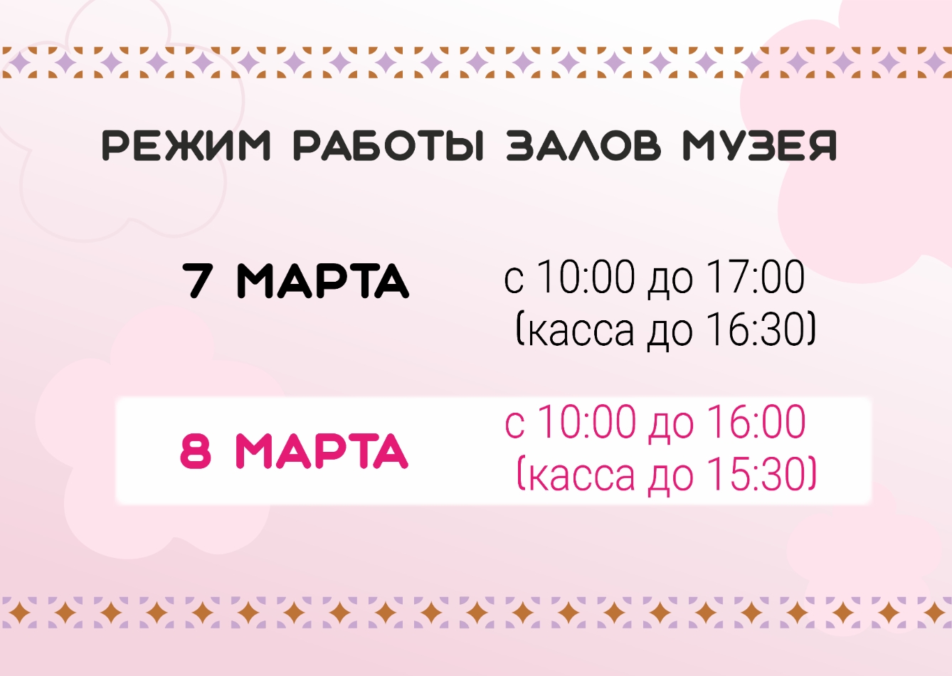 8 марта — с 10:00 до 16:00 (касса до 15:30)