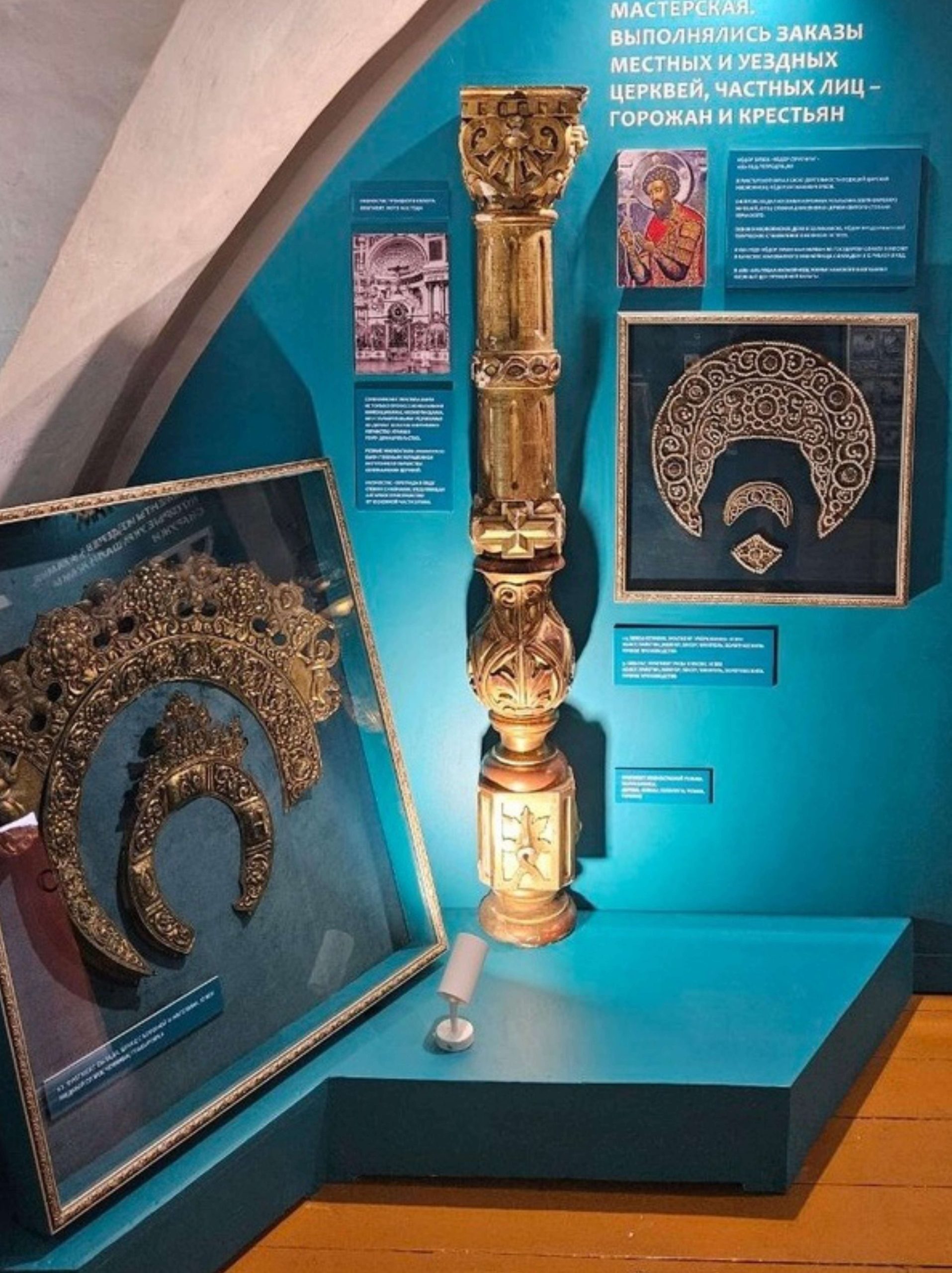 — Богоявленская церковь – 3 предмета: резной фрагмент иконостаса при входе в летний храм, створа царских врат Владимирского придела, оглавие для Жен Мироносиц у Гроба Господня (на фото стояли в интерьере).