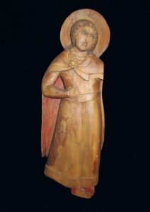 Интересна история трех фигур «Предстоящих» из Верх-Усолки. Две из них – «Богоматерь» и «Иоанн Богослов» были поставлены на музейный учет в 1952 году. Третий, «Сотник Лонгин» был найден в 1964 г. в лесу, между пос. Белый и Бельский Верх-Усольского сельсовета. Исходя из места находки, было сделано предположение о том, что скульптура должна происходить из церкви неподалеку. По размерам скульптур «Предстоящих», указанным в описи верх-усольской Покровской церкви [3, л.4 об.], а также по аналогичному характеру резьбы с остальными двумя предстоящими из этой церкви и удалось идентифицировать «Сотника». Всего в скульптурную группу «Предстоящих» из иконостаса Покровской церкви, помимо резного «Распятия», входило четыре скульптуры. Четвертая «Предстоящая» из Покровской церкви с. Верх-Усолка также сохранилась и находится в собрании Березниковского историко-художественного музея им. И.Ф. Коновалова (БИХМ КП-3488), куда была передана в 1989 году из Усольского этнографического музея (УАЭМ).