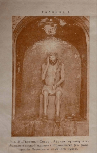 Пермская деревянная скульптура, «Пермские боги» — одно из интереснейших явлений художественной и духовной культуры Прикамья. Известно, что церковная скульптура была широко распространена на довольно большой территории Русского Севера — в бывшей Вологодской, Архангельской и др. губерниях, куда, по мнению И.Грабаря, была привнесена из Польши [1, с. 5]. Однако именно в Прикамье благодаря стараниям Н.Н. Серебренникова, который с 1923 по 1926 гг. организовал шесть экспедиций по сбору памятников искусства и старины, удалось сохранить большое количество образцов культовой скульптурной пластики. Среди них – скульптуры «Предстоящих» и «Сидящего Спасителя», фото которых, сделанное в интерьере  Воскресенской церкви г. Соликамска, было опубликовано в издании А.С. Непеина «Памятники церковной скульптуры на Севере России» [1].