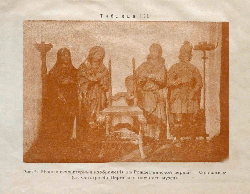 Храмовая скульптура имелась и в других церквях города. В этом отношении интересна Клировая ведомость церквей г. Соликамска за 1812 год, где прямо сообщается какие «резные образа» в какой церкви имеются [2]. В частности, в Крестовоздвиженском соборе упоминается большое Распятие, которое помещено было на правом столпе. В Симеоновском приделе Спасской церкви – Распятие резное с предстоящими Богоматерью и Иоанном Богословом и над царскими вратами – Саваоф «на облацех». В Воскресенской церкви – Христос, сидящий в темнице и около темницы четыре ангела, а также в иконостасе главного храма на карнизе восемь ангелов с орудиями страстными. В Спасо-Преображенской церкви – два резных Распятия.  В Иоанно-Предтеченской церкви – резное Распятие на верху иконостаса. Сведения о «резных образах» (деревянной скульптуре) содержатся также в церковных описях.