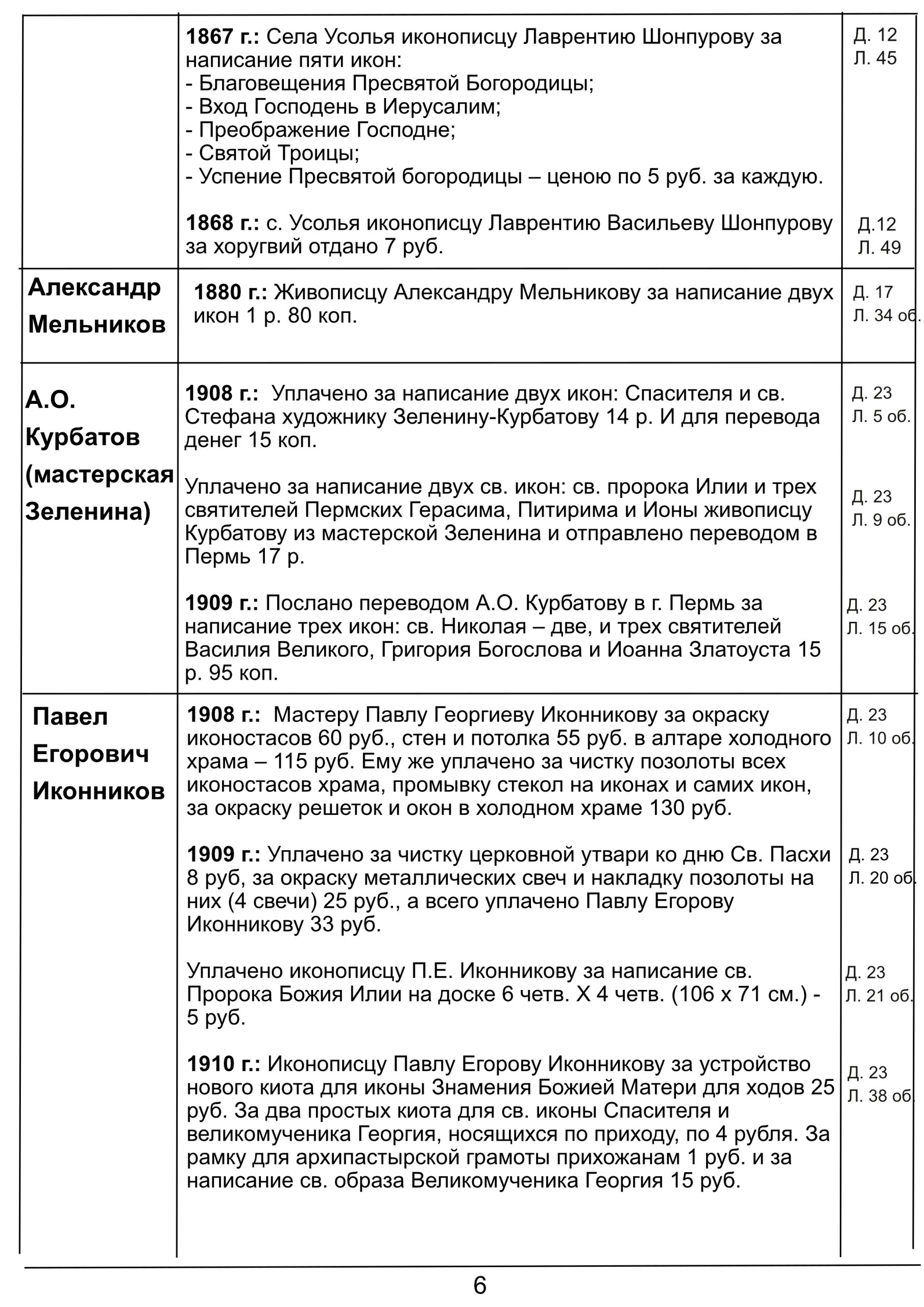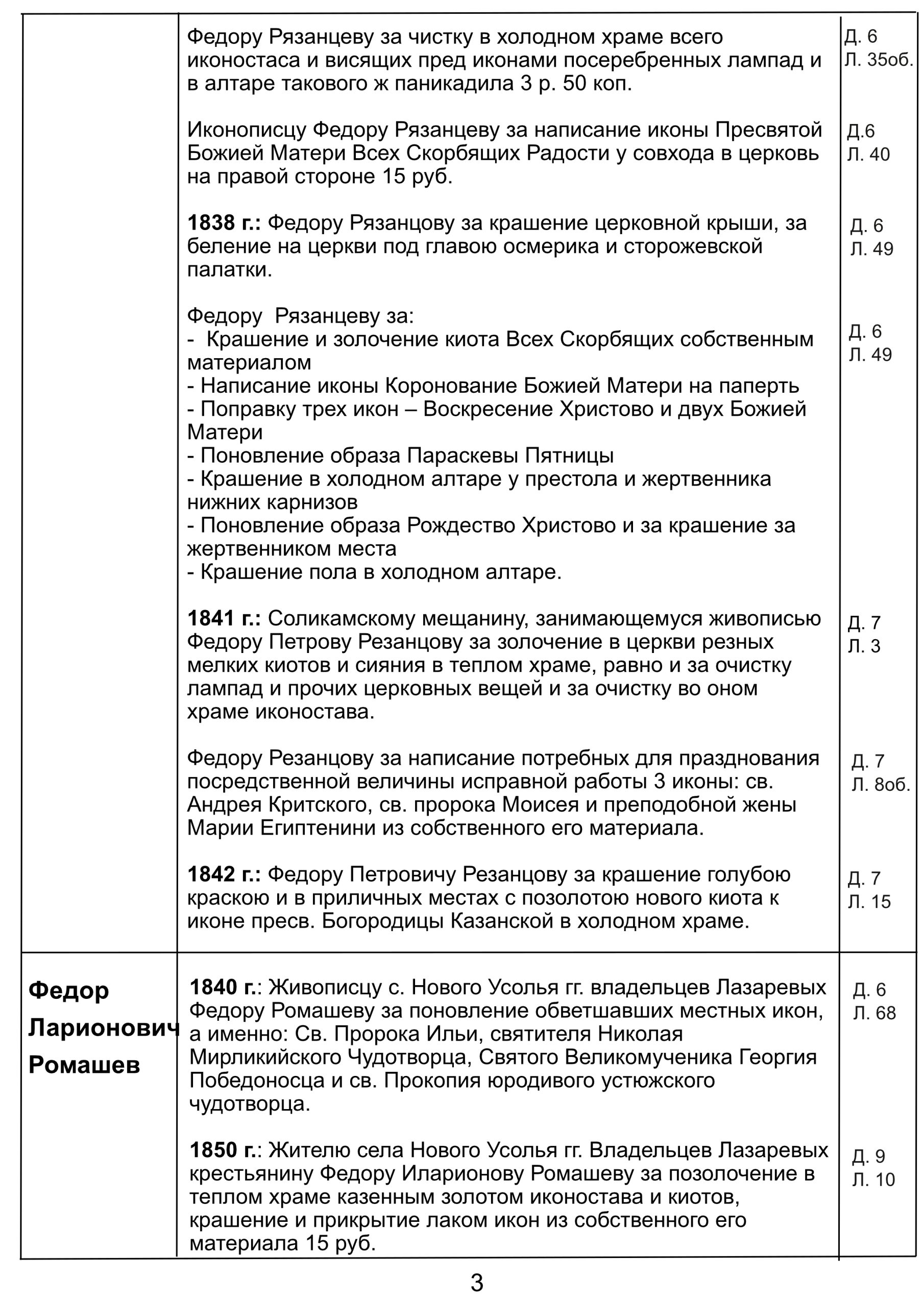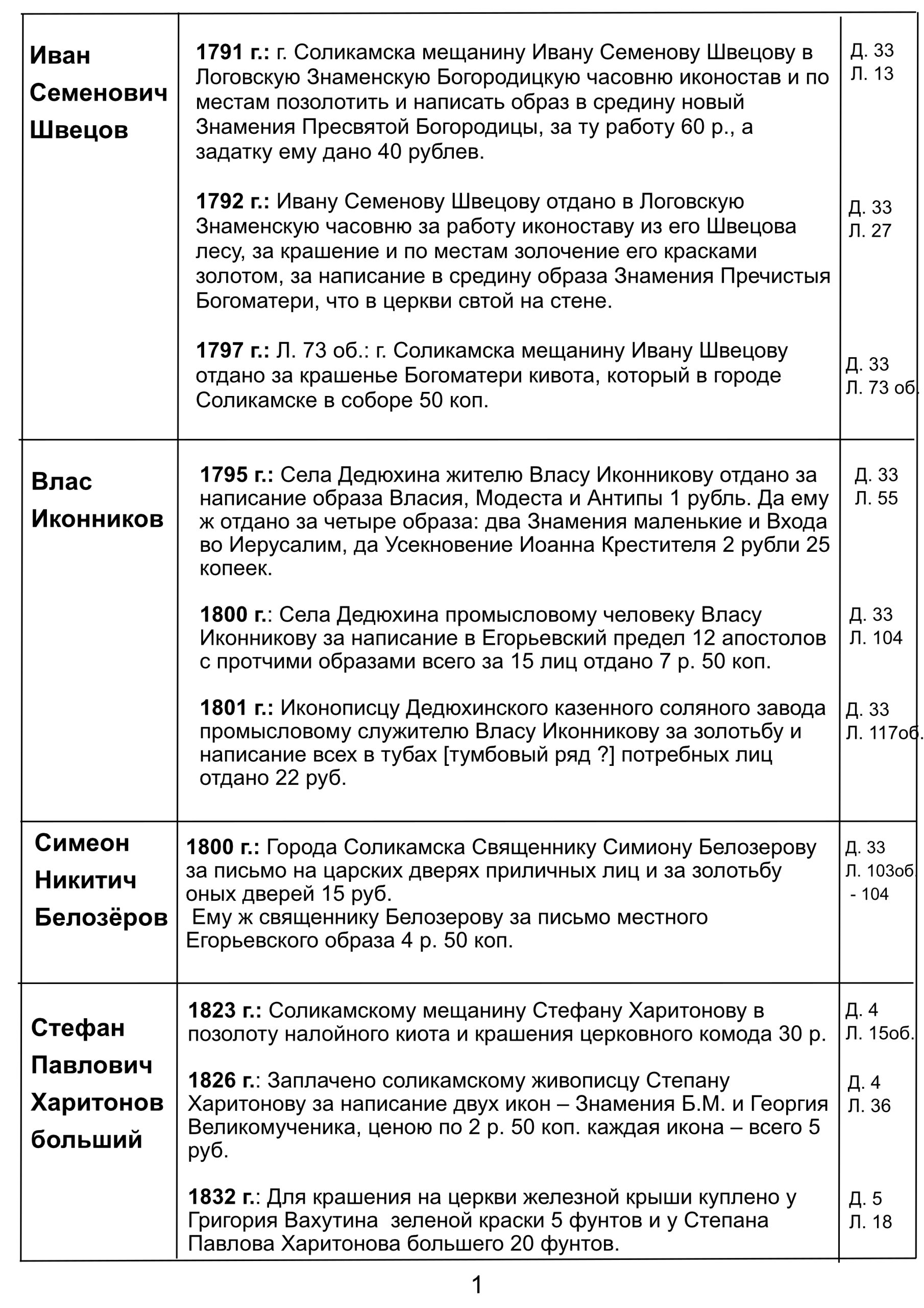 Изучая расходные документы самых разных церквей Соликамска и окрестностей, невольно приходишь к выводу, что приблизительно с 1830-х гг. фамилии соликамских иконописцев встречаются все реже. Гораздо чаще заказы начинают выполнять приглашенные усольские живописцы. Так, крепостной Строгановых И.С. Дощеников в сер. XIX в. фигурирует в документах Соликамского Свято-Троицкого монастыря [8, л. 16], Половодовской и Городищенской церквей [2]. Еще один усольский живописец, крепостной Лазаревых Ф.Л. Ромашев не единожды упоминается в расходах Богоявленской церкви [4; 5, л. 4 об.; 6, л. 29], Покровской церкви с. Верх-Усолка [3] и означенной Знаменской церкви. И. Литвинов и А. Мельников также фигурируют в расходных записях Свято-Троицкого монастыря.