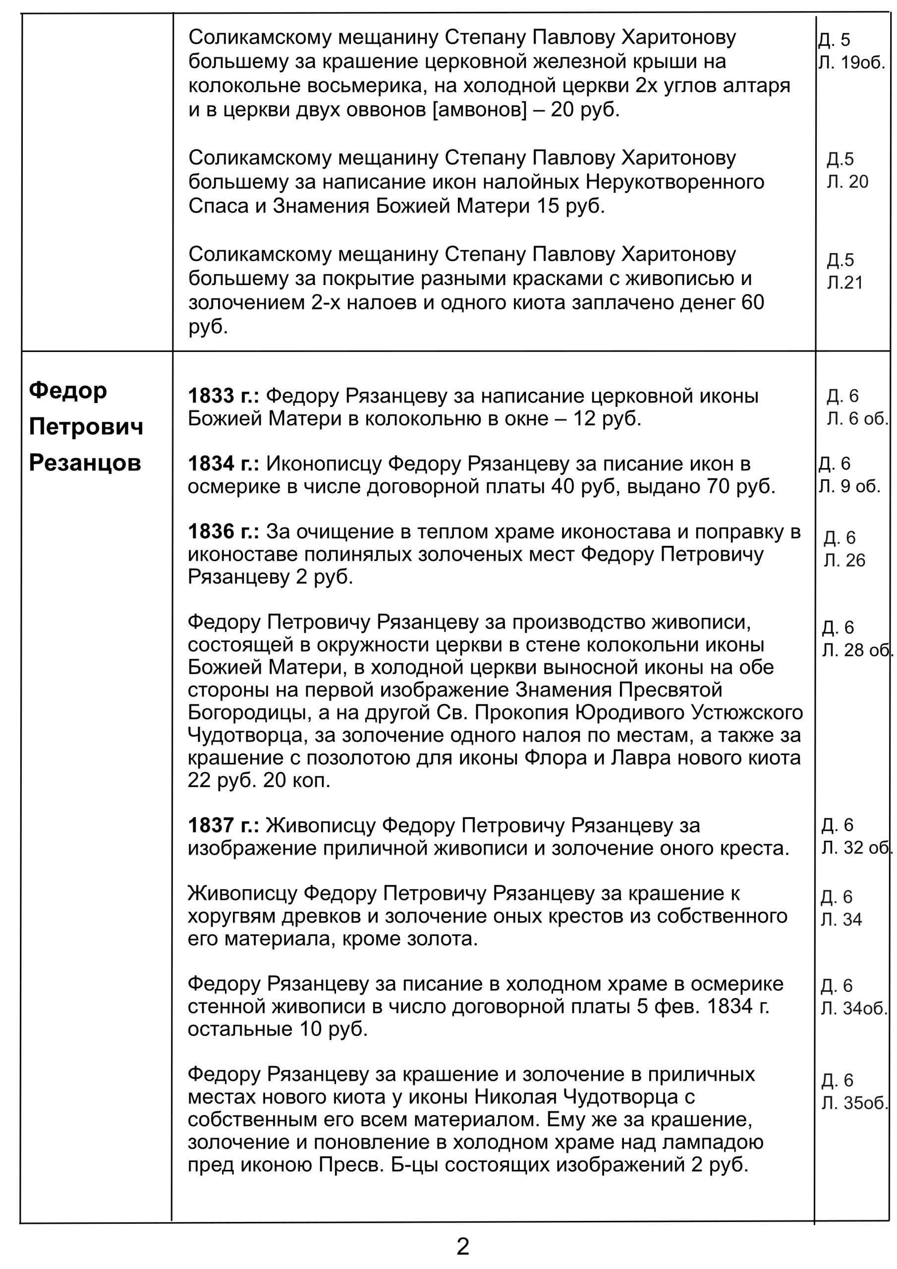 — Федор Петрович Рязанцев – «иконописец», «живописец», «соликамский мещанин, занимающийся живописью» (1833 – 1842 гг.);