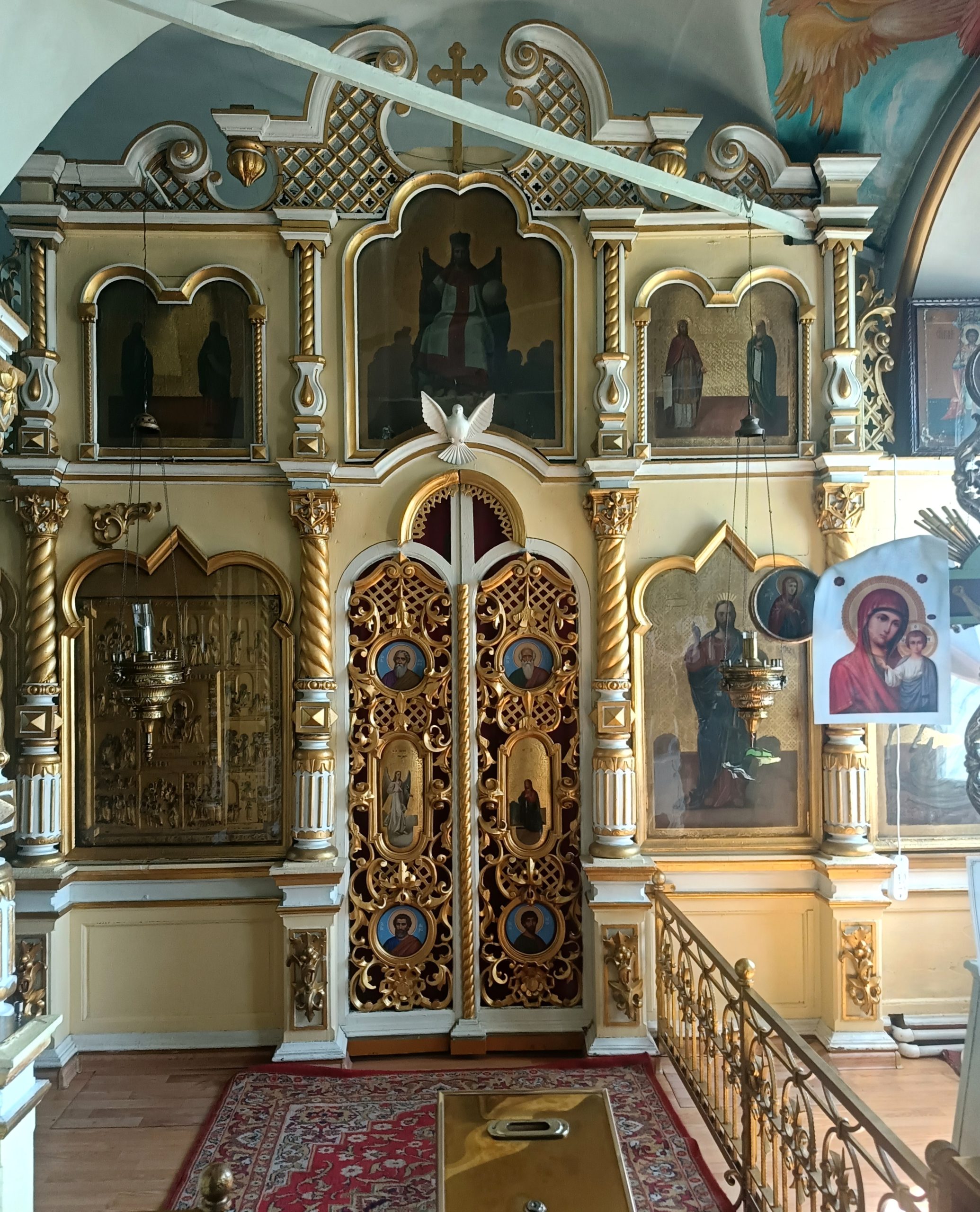 В 1836 г. соликамский иконописец П.Ф. Рязанцев чистил этот иконостас и поправлял «полинялые» места, для чего было куплено у соликамского мещанина Михаила Волкова 4 книжки одностороннего золота. Еще через 5 лет тот же П.Ф. Рязанцев совместно с крестьянином с. Городище Андреем Кырнаевым также поправляли «некоторые ветхости» иконостаса. В 1850 г. иконостас был вновь перезолочен усольцем, крепостным иконописцем господ Лазаревых Федором Ларионовичем Ромашевым (на этот раз 30 книжек двойного золота покупалось на Ирбитской ярмарке старостой Николаем Козьминых). Тот же Ромашев покрасил иконостас и прикрыл лаком иконы в нем. В следующий раз иконостас был вновь покрашен уже в 1862 г., также усольцем, временно-обязанным графини Строгановой служителем Иваном Алексеевичем Кирпичевым, а спустя еще два года – вновь покрашен и позолочен Иваном Федоровичем Гусевым (который значился крепостным Лазаревых из с. Усолье [5, л. 68]). К сожалению, этот иконостас работы П.Е. Гребешкова не сохранился, хотя не исключено, что какие-то резные элементы от него могли остаться. Ныне существующий иконостас зимнего придела был сооружен неизвестно когда. Возможно, в период с 1881 по 1907 гг., так как расходные документы за этот период отсутствуют. Но однозначно можно сказать, что по описи 1875 года иконостас был другой.
