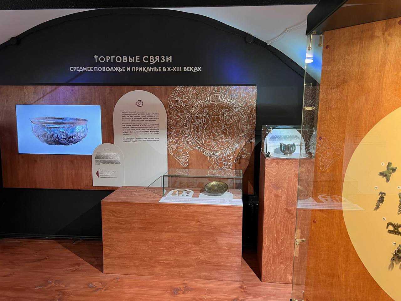 Экспозиция включает информацию об археологических находках, свидетельствующих об этих связях. В частности, представлены данные о серебряных сосудах сасанидского Ирана (III–VII века), обнаруженных в Прикамье и использовавшихся в культовых обрядах. Один из notable артефактов — серебряная чаша с древнегреческой надписью, найденная в 1949 году у деревни Пеняхиной. Её гипсовая копия демонстрируется в зале.